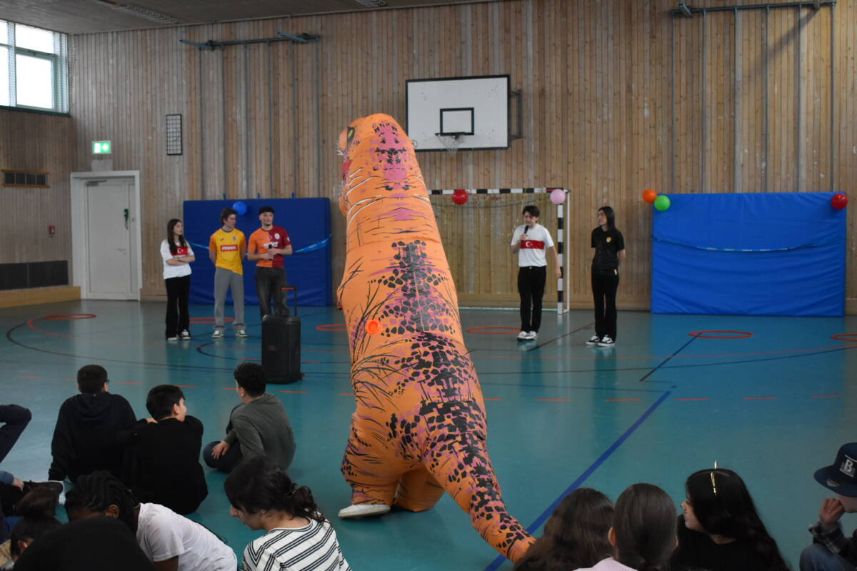 Aus den Lautsprechern klang fröhliche Musik, während engagierte Schülerinnen und Schüler der 10. Klassen eine lange Polonaise starteten. Sie holten die Kinder direkt aus den Klassenzimmern ab. Nach einer schwungvollen Runde durch das Schulhaus endete der bunte Zug schließlich in der Turnhalle.