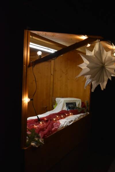 Nach dem Programm ging es hinaus auf den festlich beleuchteten Pausenhof, wo uns die Gemeinde die Weihnachtsbuden ihres Christkindlmarktes zur Verfügung gestellt hatte. In den liebevoll dekorierten Buden gab es so vieles zu entdecken: Die 9. Klassen verkauften Hotdogs, es wurden im Werkunterricht hergestellte Weihnachtsartikel angeboten, und ein wunderschöner Schulkalender mit Kunstwerken der 8. Klassen fand großen Anklang. Der Elternbeirat sorgte mit heißem Punsch und leckeren Speisen, die viele Eltern beigesteuert hatten, für das leibliche Wohl.